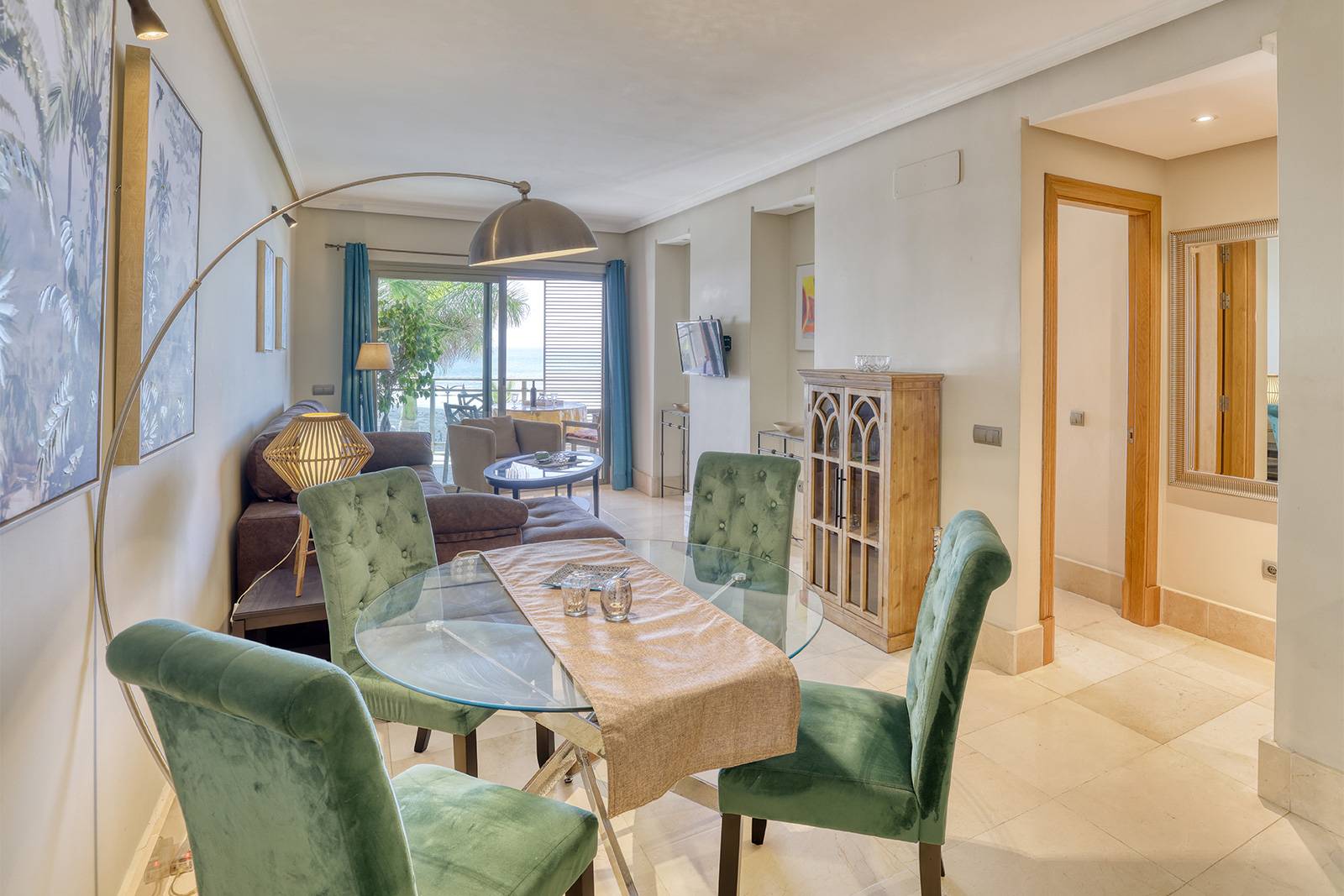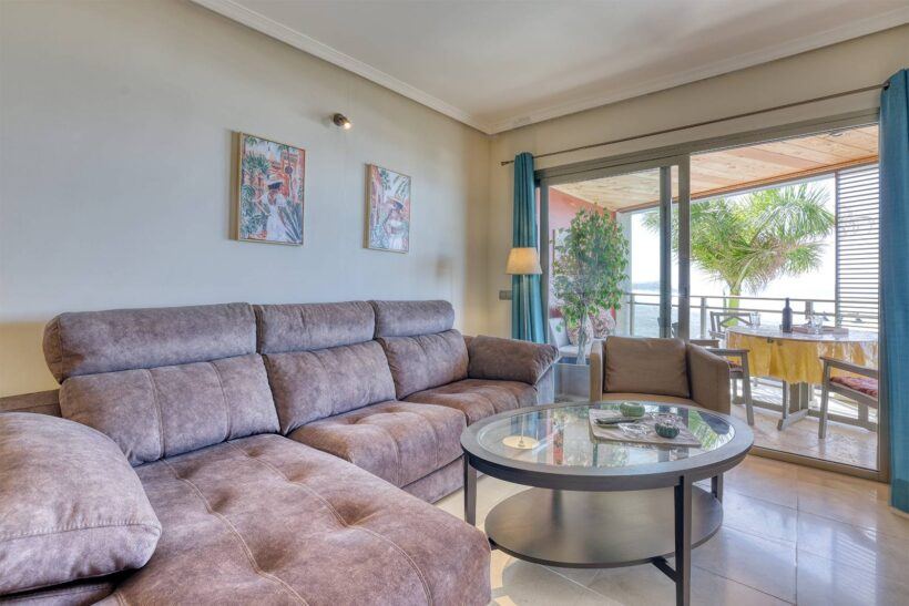 Die rund 85 Quadratmeter große Wohnung liegt im ersten Stock in einem gepflegten Apartmenthaus unmittelbar an der Strandpromenade. Schon beim Betreten fällt die helle und freundliche Atmosphäre auf. Der Wohnbereich öffnet sich über große Fenster zur Terrasse hin, sodass der Blick immer wieder zum Meer wandert.