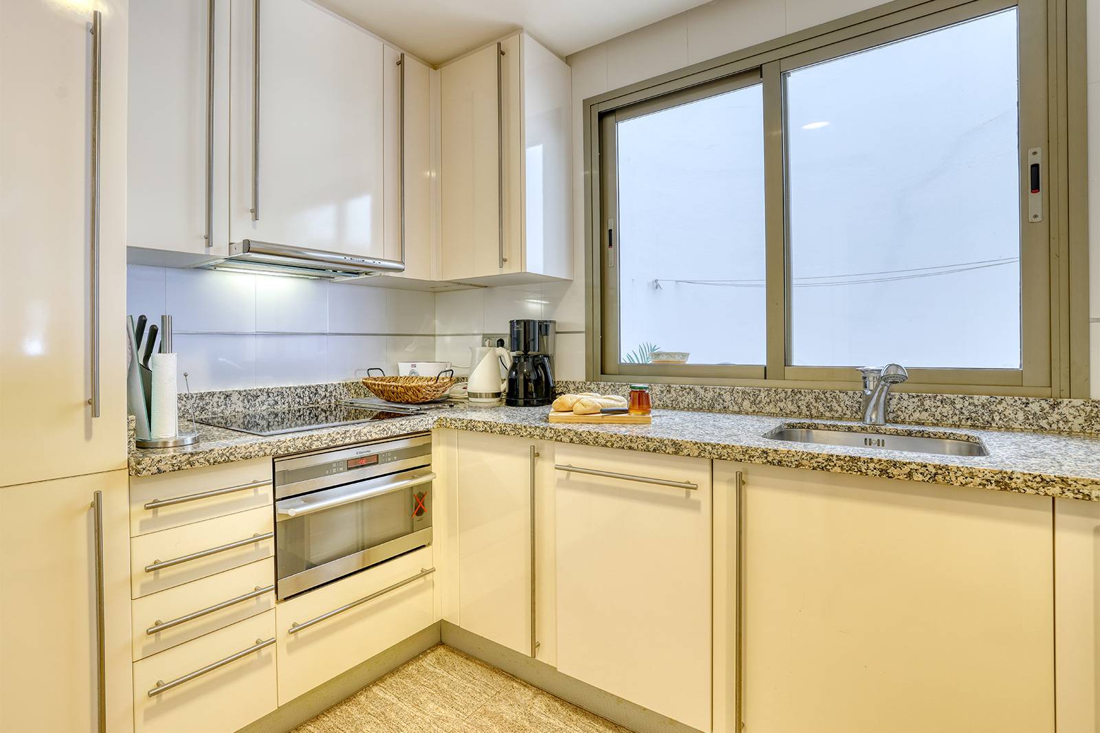 Auch im Inneren überzeugt die Wohnung mit einer gepflegten und geschmackvollen Einrichtung. Wohn- und Essbereich gehen harmonisch ineinander über, während die moderne Küche durch eine praktische Theke abgetrennt ist und alles bietet, was für die Selbstversorgung im Urlaub benötigt wird.