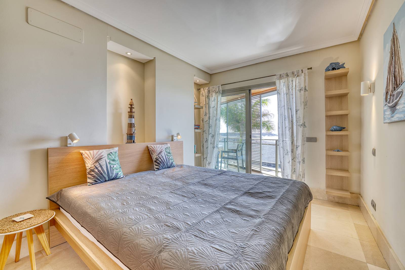 Die Wohnung verfügt über zwei komfortable Schlafzimmer. Besonders reizvoll ist das vordere Schlafzimmer mit direktem Zugang zum Balkon – hier fällt der Blick bereits vom Bett aus auf das Meer.