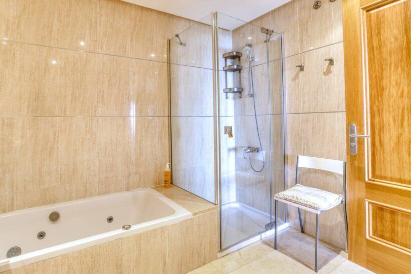 Das Badezimmer ist großzügig gestaltet und sowohl mit Dusche als auch mit Badewanne ausgestattet.