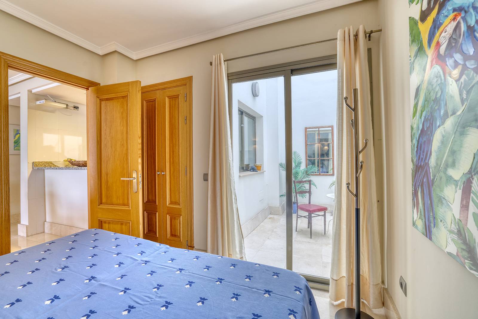 Das zweite Schlafzimmer liegt ruhiger im hinteren Teil der Wohnung und hat Zugang zu einem kleinen Innenhof.