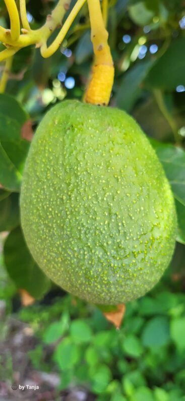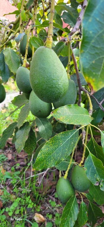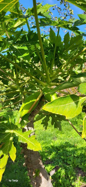 Neben reifenden Avocados, die schwer an den Zweigen hängen, zeigen die Bilder auch Papayas in unterschiedlichen Entwicklungsstadien – von noch schlank und grün bis bereits deutlich ausgeformt.
