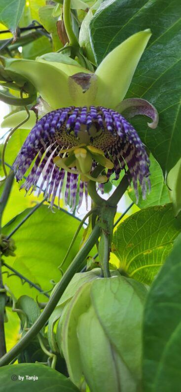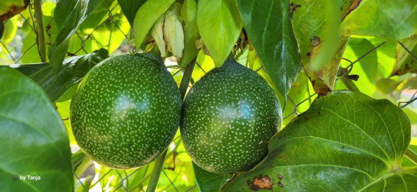 Ein weiteres Motiv bildet die Passionsfrucht: dicht behangen, noch unreif, mit ihrer charakteristisch gesprenkelten Schale. Gemeinsam mit den Passionsblüten der vorherigen Aufnahme zeigen sie den auf La Palma häufig zeitgleich ablaufenden Kreislauf von Blüte und Frucht.