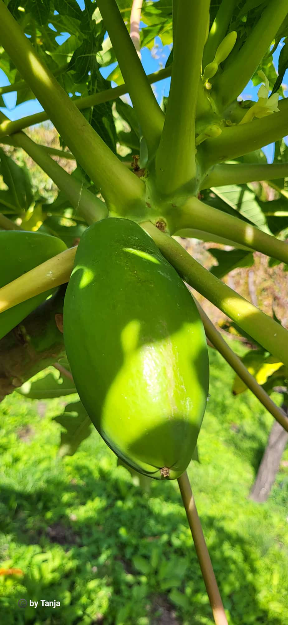 Neben reifenden Avocados, die schwer an den Zweigen hängen, zeigen die Bilder auch Papayas in unterschiedlichen Entwicklungsstadien – von noch schlank und grün bis bereits deutlich ausgeformt.
