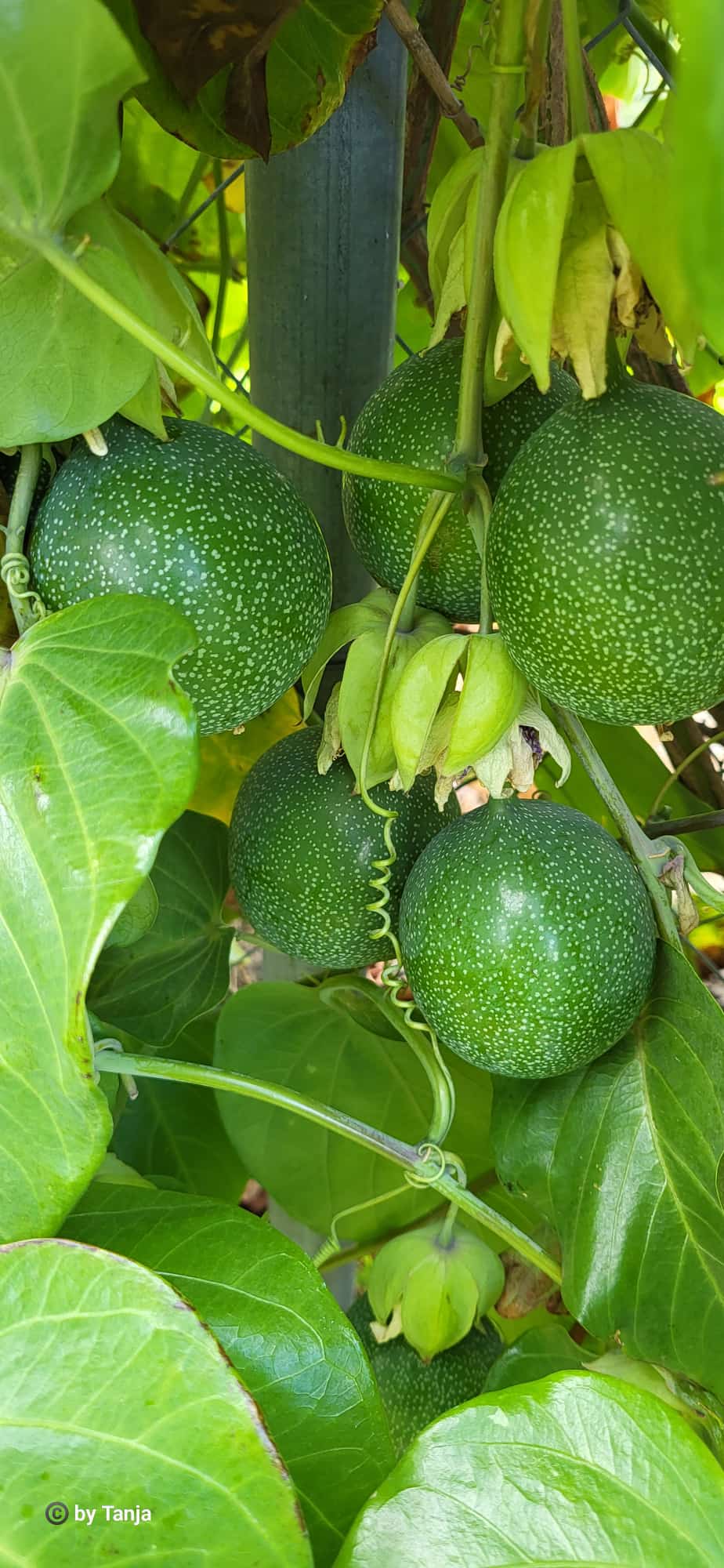 Ein weiteres Motiv bildet die Passionsfrucht: dicht behangen, noch unreif, mit ihrer charakteristisch gesprenkelten Schale. Gemeinsam mit den Passionsblüten der vorherigen Aufnahme zeigen sie den auf La Palma häufig zeitgleich ablaufenden Kreislauf von Blüte und Frucht.