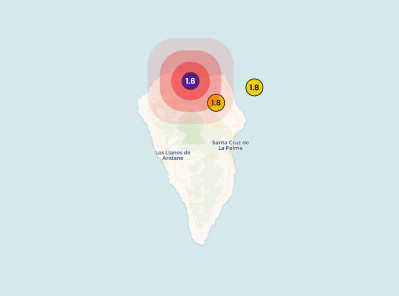 Auch dieses erreichte eine Stärke von 1,8 mbLg und lag in einer Tiefe von 10 Kilometern. - Nur zwei Minuten später, um 06:54 Uhr, folgte ein weiteres Beben mit einer Stärke von 1,6 mbLg vor der Küste von Villa de Garafía, in rund 7 Kilometern Tiefe.