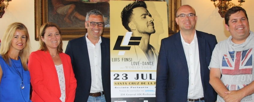 Freude über den großen Coup, Luis Fonsi nach Santa Cruz de La Palma gelotst zu haben (v.l.n.r): Festrätin Virginia Espinosa, Inseltourismusrätin Alicia Vanoostende, Bürgermeister Sergio Matos, Inselpräsident Anselmo Pestana und Mitveranstalter Maikel Chacón von El Time-Eventos, der auch Redakteur der gleichnamigen Online-Zeitung ist.