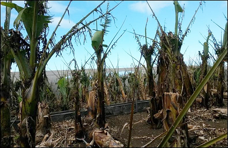 Orkanartige Böen bis zu 129 Stundenkilometern wurden am Wochenende, 7. und 8. März 2015, in der Wetterstation der staatlichen AEMET-Agentur auf dem El Time im Westen von La Palma gemessen. Wie die Inselregierung jetzt mitteilte, entstanden dadurch im Nordwesten der Insel insbesondere in den Küstenbereichen starke Schäden in den Bananen- und Avocadoplantagen. Im Aridanetal sind nach Angaben von Landwirtschaftsrat José Basilio Pérez zwischen 60 und 70 Prozent der Avocado-Früchte vom Baum gefallen, die nach den starken Winden im Januar und Februar 2015 noch übriggeblieben waren. Demnach schädigten die Sturmböen auch die Plátano-Fincas von der Zone um Los Llanos bis hinab nach El Remo in zunehmenden Maße – an der Küste sind laut Pérez bis zu 50 Prozent der Ernte und außerdem viele Abdeck-Netze zerstört. In El Paso und Los Llanos meldeten die Landwirte im Blick auf die Orangen Verluste in der Größenordnung um 40 Prozent.