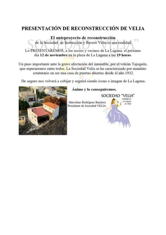 Die Sociedad de Instrucción y Recreo Velia in La Laguna wird am Dienstag, den 12. November, um 19 Uhr auf der Plaza de La Laguna den Vorentwurf für den Wiederaufbau ihres Vereinsgebäudes vorstellen.