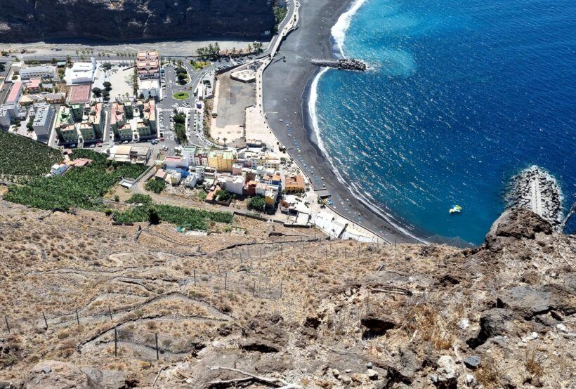 Blick vom Wanderweg GR-131 auf Puerto de Tazacorte. Der steile Abschnitt zwischen El Time und dem Hafen ist derzeit wegen Bauarbeiten vorübergehend gesperrt.