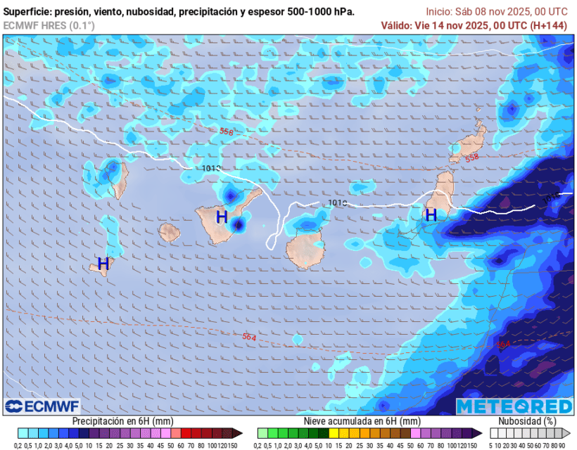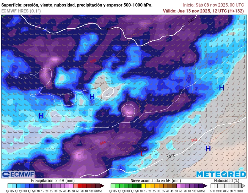 Am Donnerstag, den 13. November, liegt das Tiefdruckgebiet näher bei den Inseln. Auf den ECMWF-Karten ist eine deutliche Zunahme von Feuchtigkeit und Niederschlag zu erkennen – besonders für La Palma, El Hierro und den Westen Teneriffas.