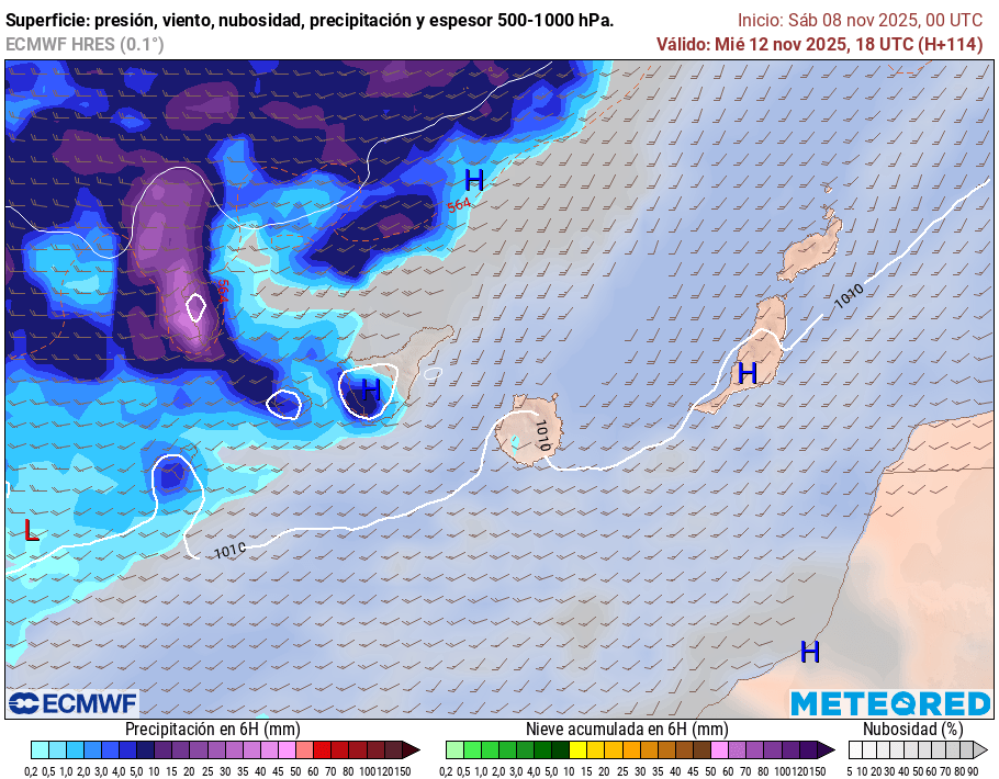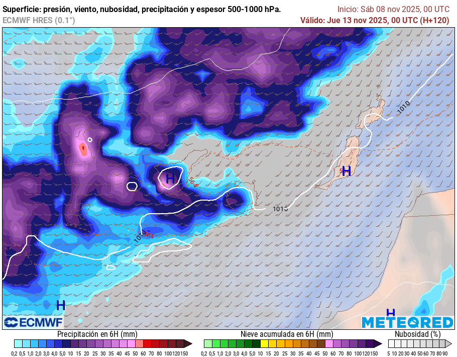 Am Donnerstag, den 13. November, liegt das Tiefdruckgebiet näher bei den Inseln. Auf den ECMWF-Karten ist eine deutliche Zunahme von Feuchtigkeit und Niederschlag zu erkennen – besonders für La Palma, El Hierro und den Westen Teneriffas.