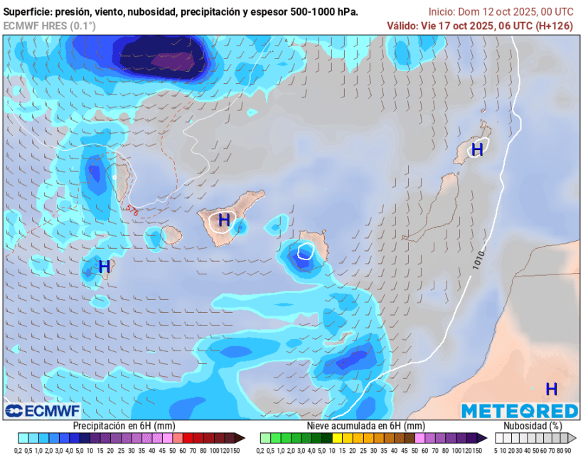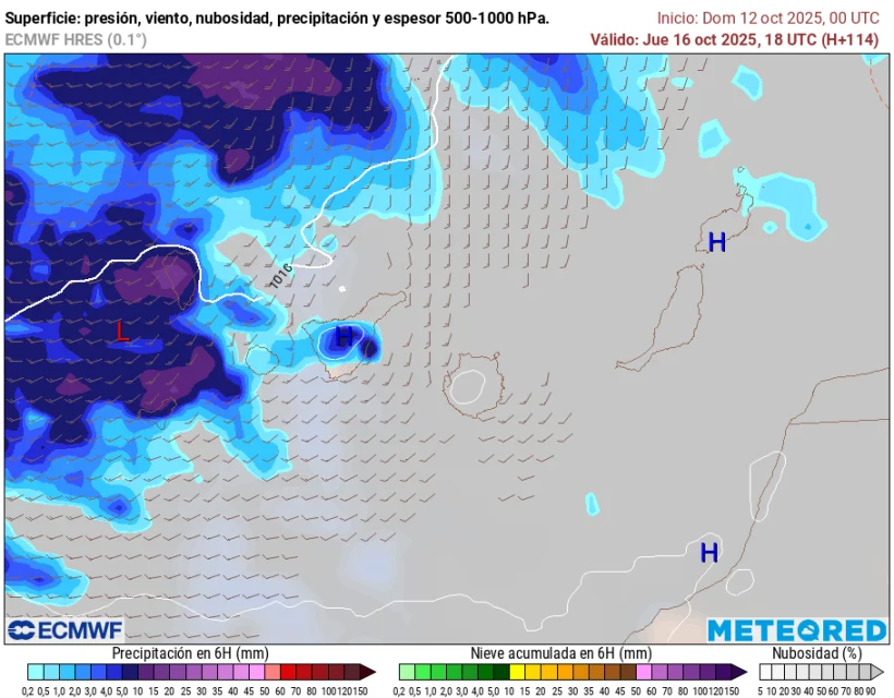 Die aktuelle Vorhersage des europäischen Wettermodells ECMWF zeigt für die zweite Wochenhälfte eine schwache Wetterfront über dem Atlantik, die am Donnerstagabend oder Freitag (16./17. Oktober) auch die Kanarischen Inseln streifen könnte.
