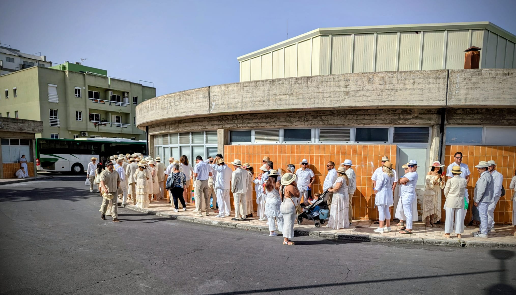 Los Llanos, Busstation: In Weiß gekleidete Los-Indianos-Besucher warten auf den Bus nach Santa Cruz.