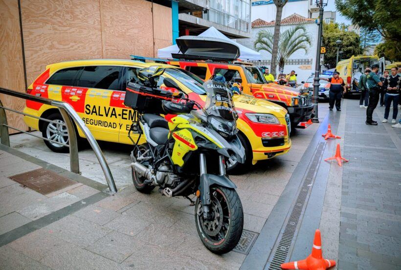 Einsatzkräfte und Fahrzeuge verschiedener Organisationen bei der Sicherheitsveranstaltung in Los Llanos.