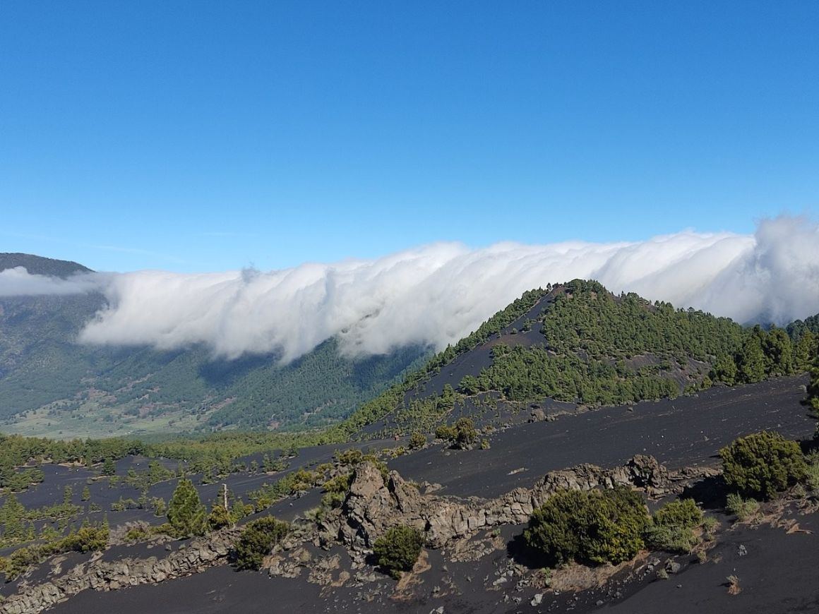 Der „Wolkenwasserfall“ über der Cumbre – ein vertrautes Wetterphänomen im Kontrast zu Puder, Asche und angekündigtem Saharastaub (Calima). Foto: Andrea Jährlich (Januar 2026).