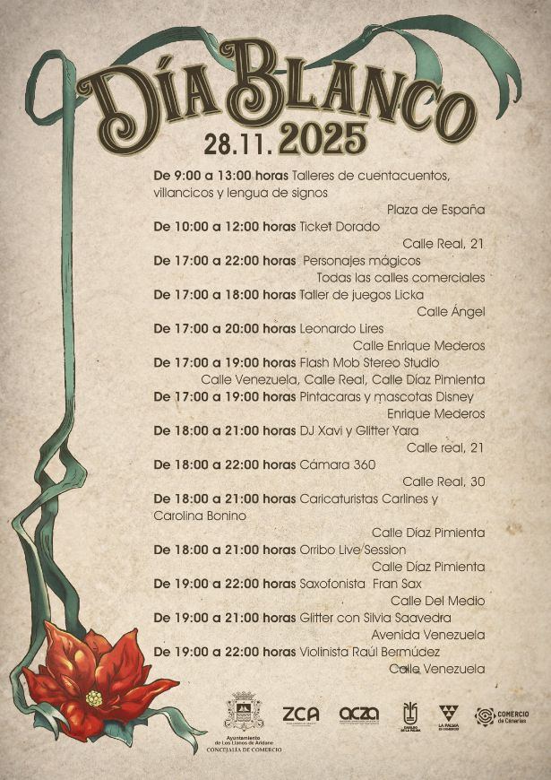 Los Llanos de Aridane lädt gemeinsam mit den Handelsverbänden ZCA und ACZA am kommenden Freitag, den 28. November, zum traditionellen Día Blanco ein. Das Stadtzentrum verwandelt sich an diesem Tag in eine lebendige Bühne voller Musik, Workshops und Aktivitäten für die ganze Familie.