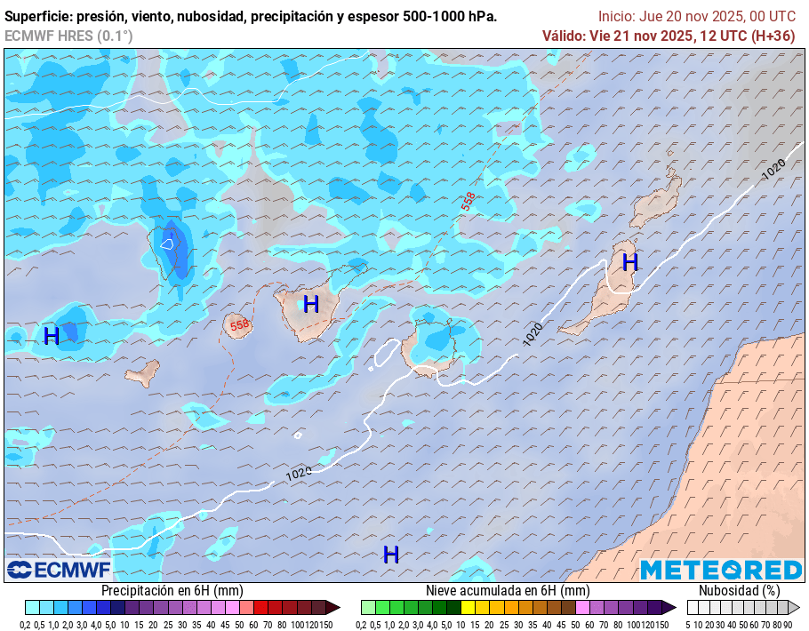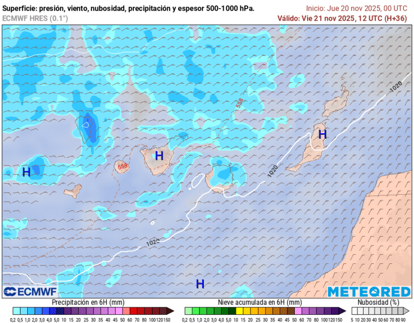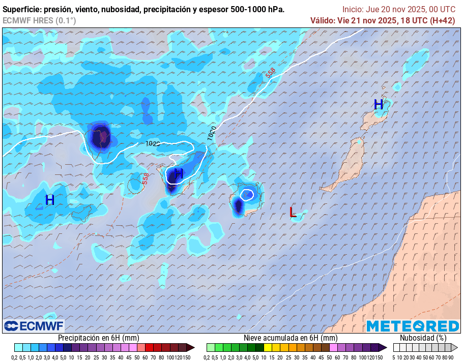 Aus Nordwesten erreichen feuchte Luftmassen die Insel. Die aktuellen ECMWF-Prognosen zeigen im Laufe des Tages Niederschlagsfelder, die besonders am Vormittag und erneut am späten Nachmittag über La Palma ziehen.