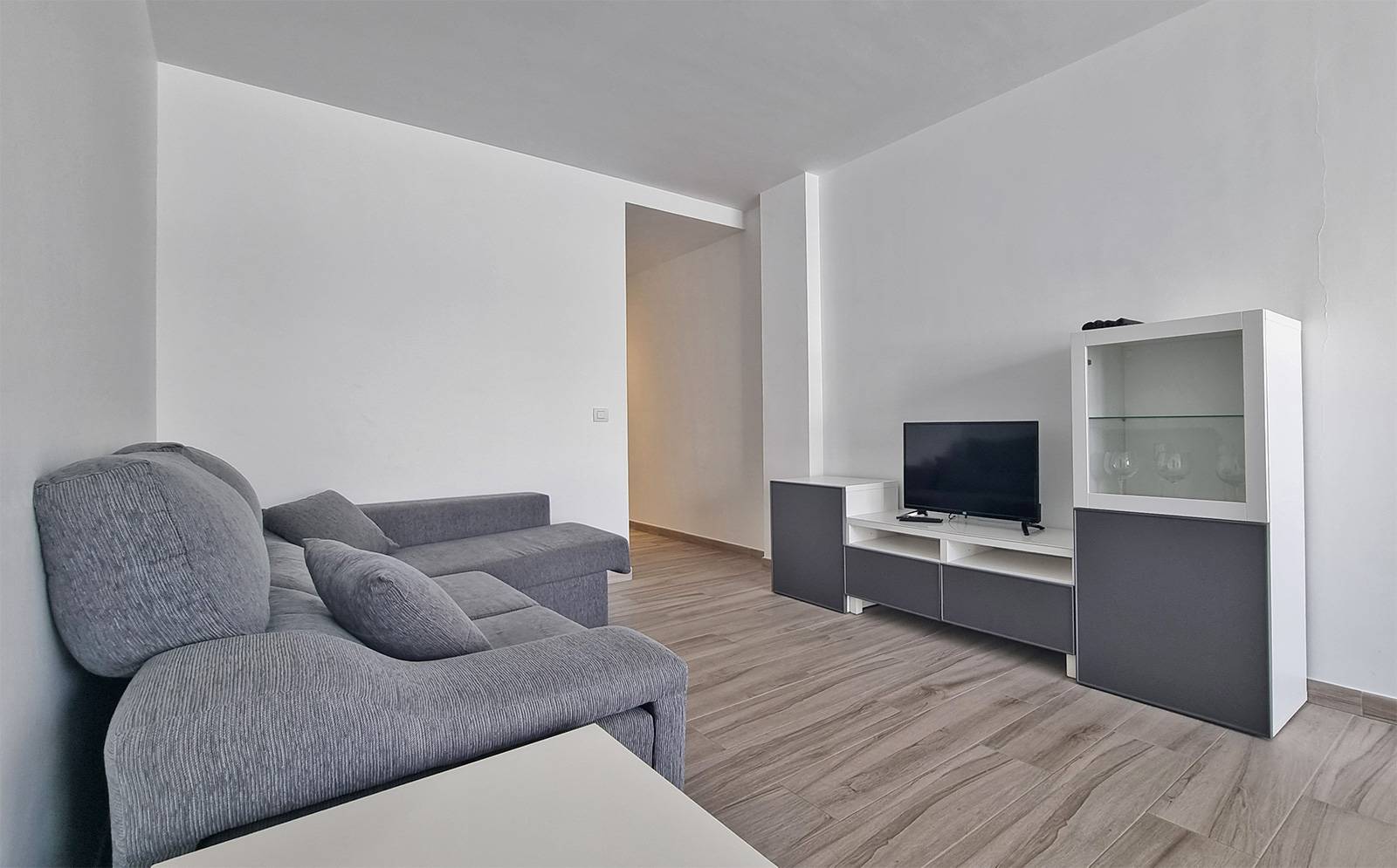 Im hellen Wohnbereich erwartet Sie ein modernes, freundliches Ambiente mit gemütlichem Sofa und Smart-TV – der perfekte Ort zum Abschalten nach einem Strandtag.