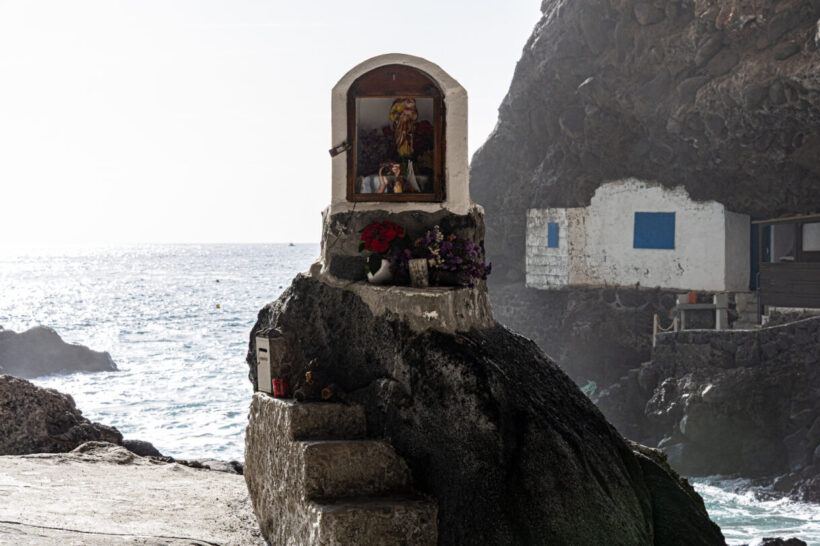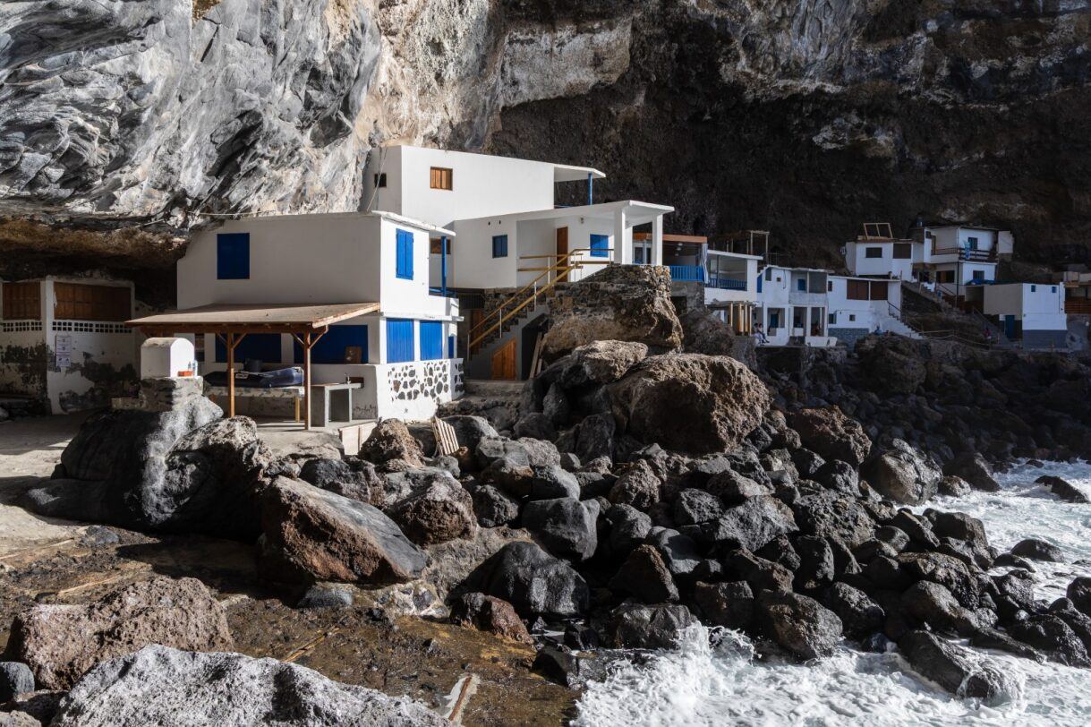 Die Lage ist spektakulär: Eine hohe, überhängende Felswand schützt die kleinen Gebäude vor Steinschlag und Wind, während sich der Atlantik nur wenige Meter entfernt mit voller Kraft an den Lavablöcken bricht. Die Häuser – meist einfache Funktionsbauten mit blauen Fensterläden – dienten ursprünglich als Geräteschuppen und Aufenthaltsräume für Fischer. Einige werden bis heute gepflegt und instand gehalten. Zu den wenigen baulichen Details zählt auch ein kleines Marienbild, geschmückt mit Blumen und Kerzen.