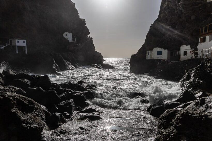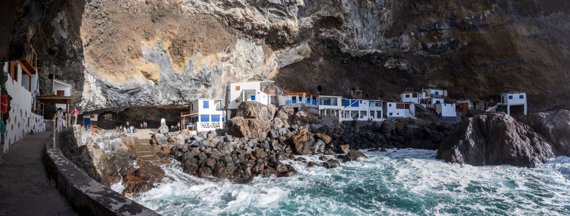 An der Westküste La Palmas, in der Gemeinde Tijarafe, befindet sich Proís de Candelaria – verborgen unter einer steilen Felswand unmittelbar am Atlantik. Die kleine Ansammlung weißer, schlicht gebauter Häuser klammert sich an die Felsen oberhalb des Atlantiks und erzählt von einem Leben im Rhythmus des Meeres.
