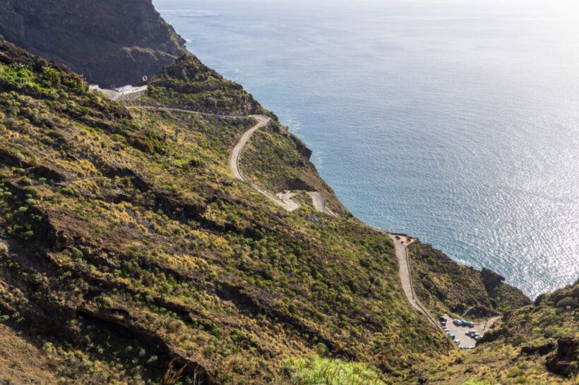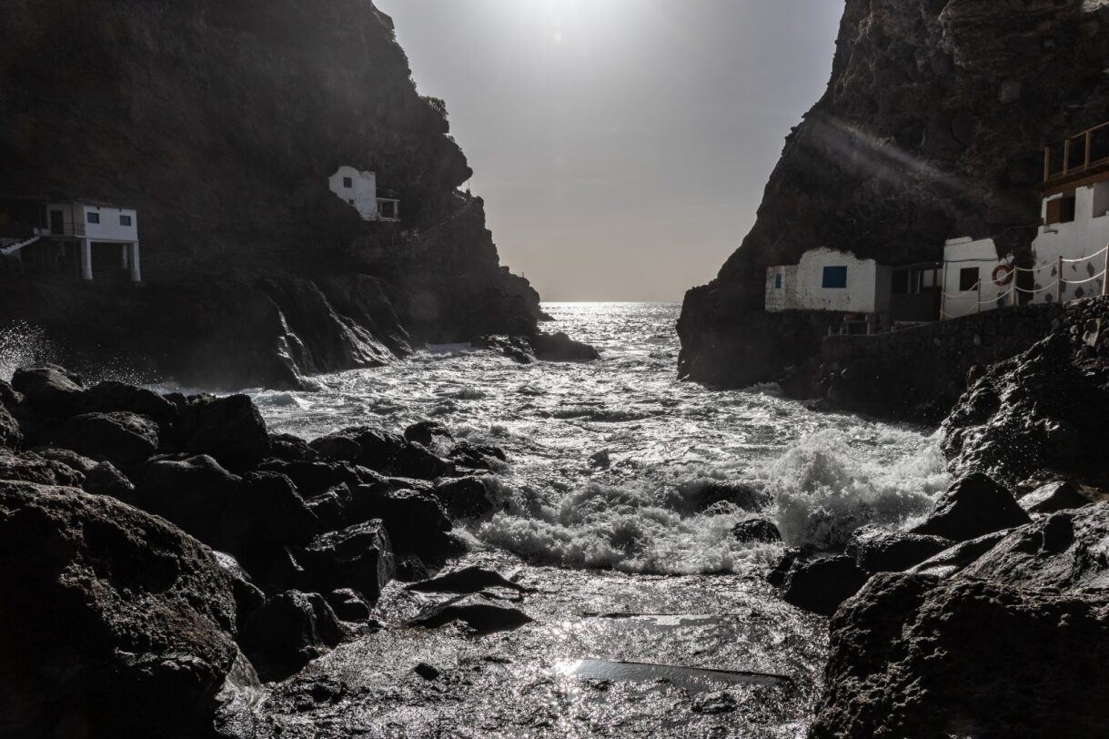 Unten eröffnet sich ein eindrucksvolles Bild: Häuser unter dem Fels, dunkles Lavagestein, weiß schäumende Wellen und das stetige Donnern des Meeres.