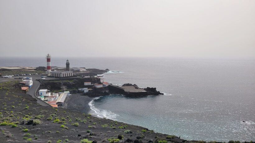 Die Salinen von Fuencaliente am 16. Februar – Leuchtturm und Küstenlinie erscheinen unter dem dichten Staubschleier nur noch weich konturiert, der Horizont ist kaum klar erkennbar.