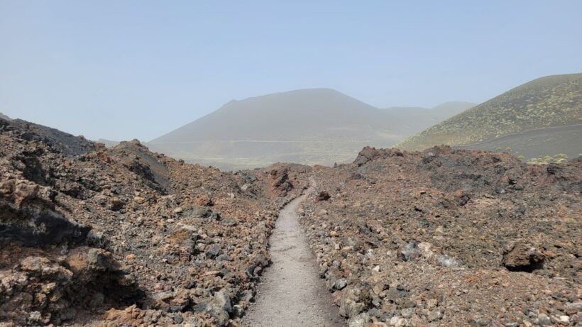 Blick über die Lavafelder bei Fuencaliente – die Kraterkegel im Hintergrund verschwimmen im dichten Staubschleier, die Fernsicht ist deutlich eingeschränkt.