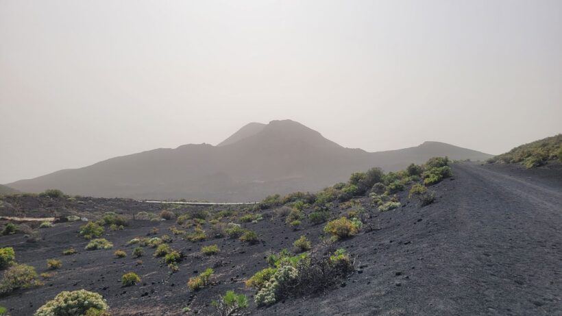 Wanderweg zwischen Teneguía und San Antonio – Konturen und Farben wirken unter der anhaltenden Staubbelastung merklich abgeschwächt, die Landschaft erscheint flach und diffus.