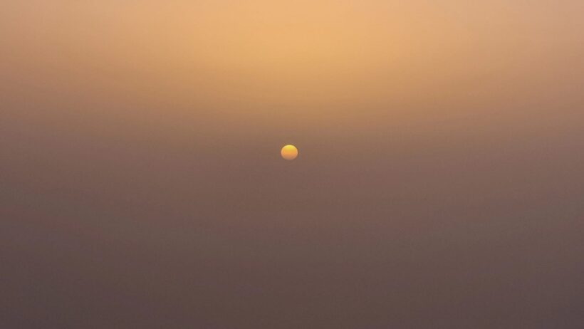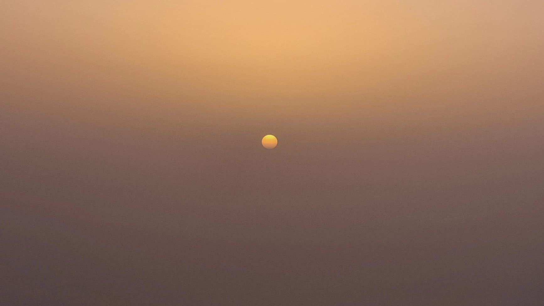 Noch bevor sie den Horizont erreichte, verschwand sie vollständig im Staub – ein Sonnenuntergang ohne klare Konturen.