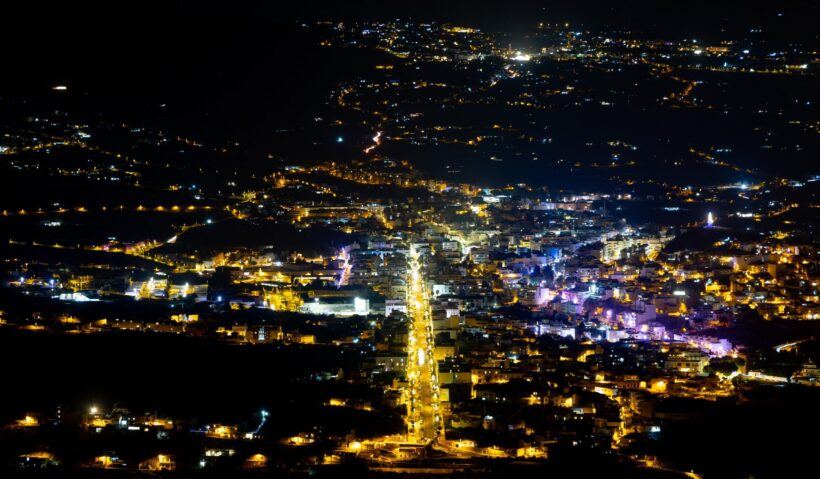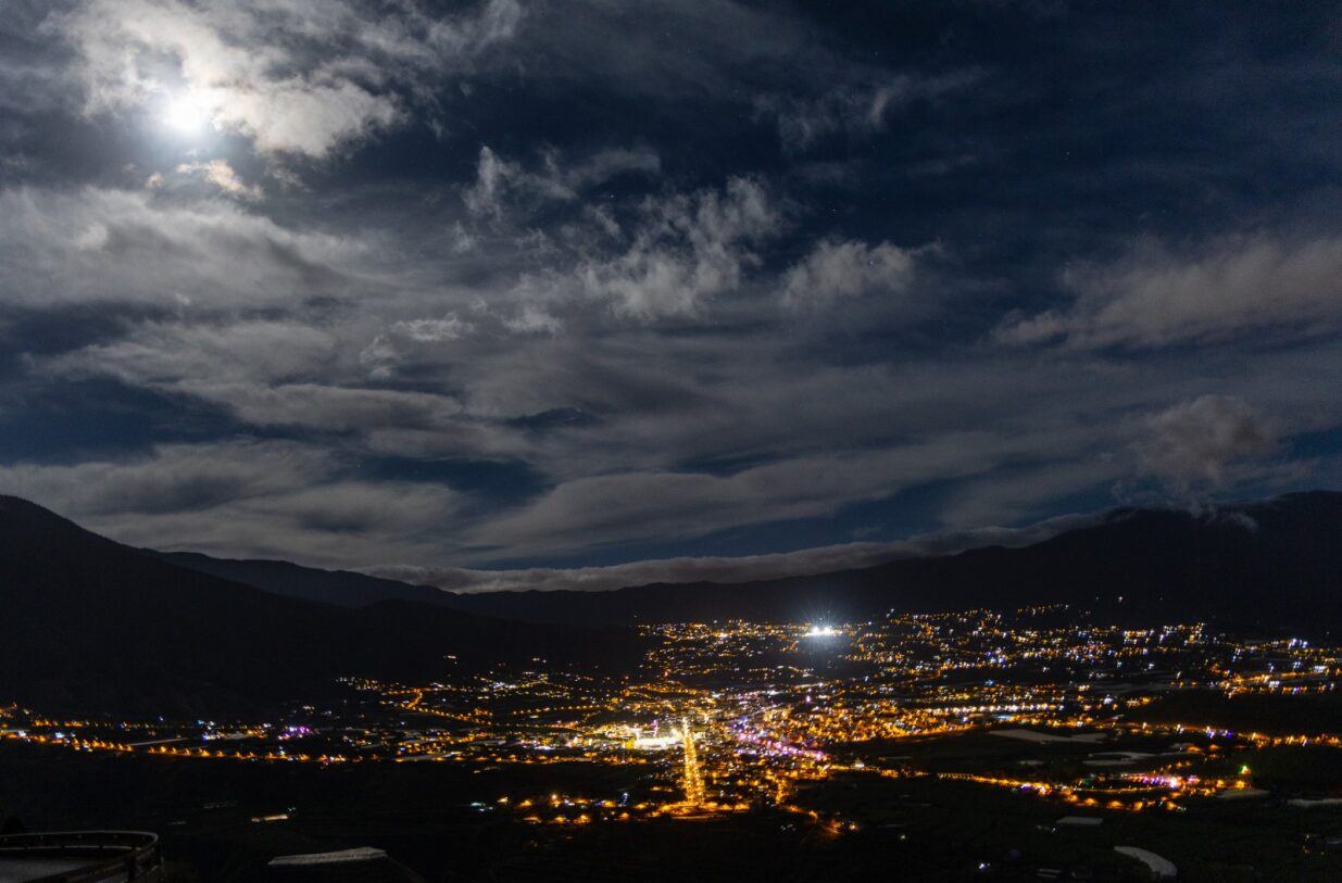 Die nächtlichen Aufnahmen aus erhöhter Perspektive erweitern diesen Eindruck. Sie zeigen die Stadt als Ganzes: ein Geflecht aus Straßen, Lichtachsen und Wohnvierteln, eingebettet in die dunkle Landschaft des Aridanetals. Von oben wird sichtbar, wie weit sich Los Llanos erstreckt – und wie sehr Licht in diesen Tagen Orientierung, Nähe und Zusammenhalt symbolisiert.