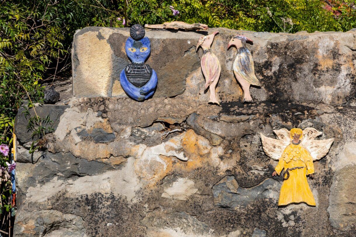 Zwischen all dem finden sich stille Details: eine alte öffentliche Wasserquelle aus dem Jahr 1963. Blumen, die über Mauern wachsen. Kleine Figuren an Fassaden, fast beiläufig platziert.