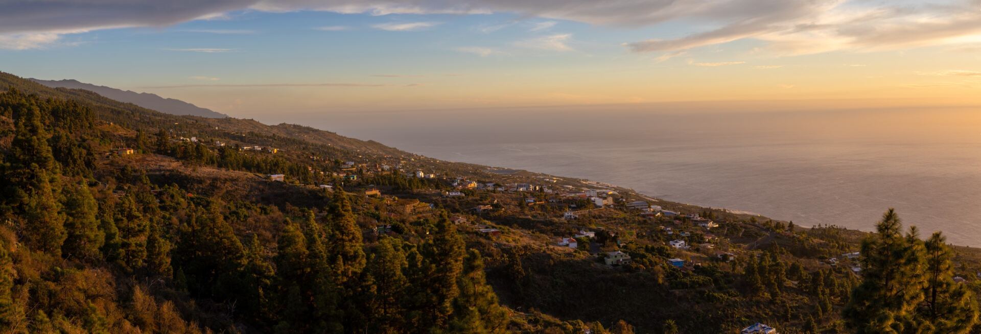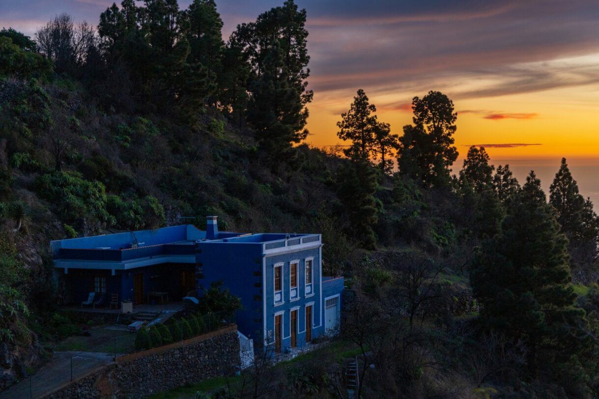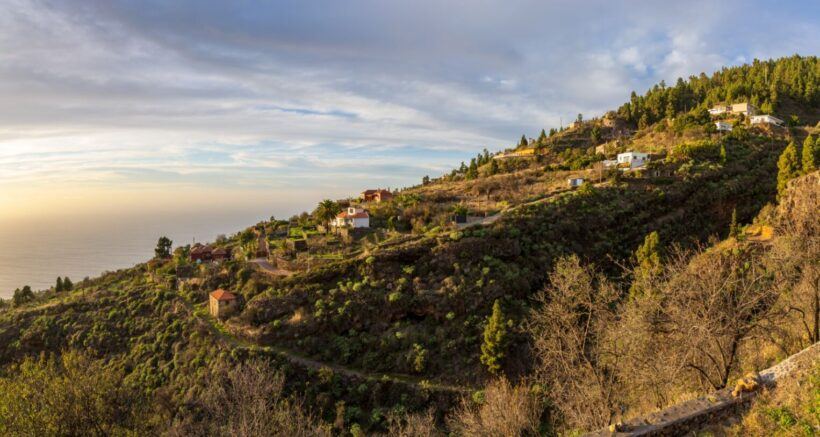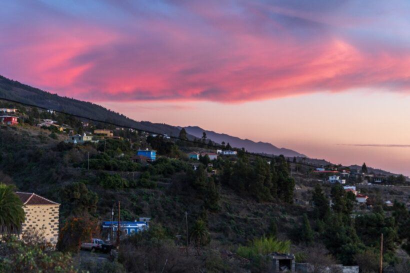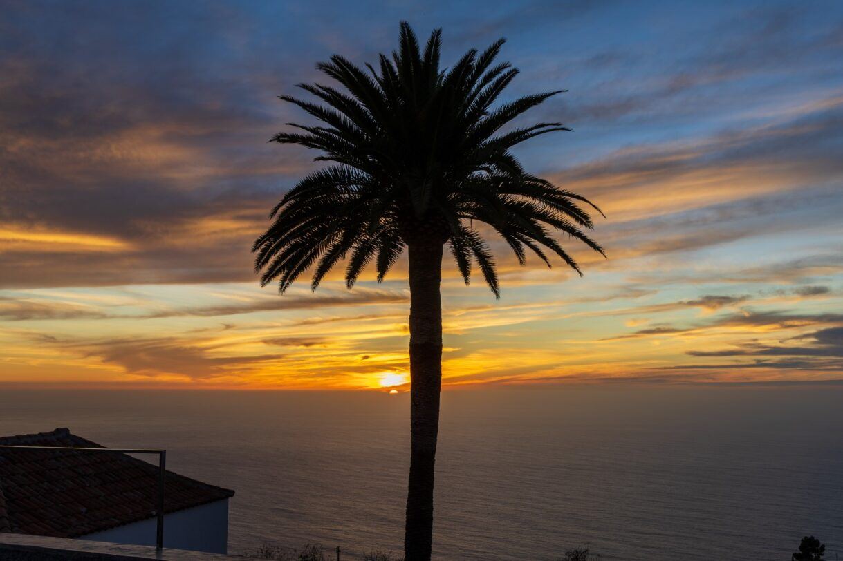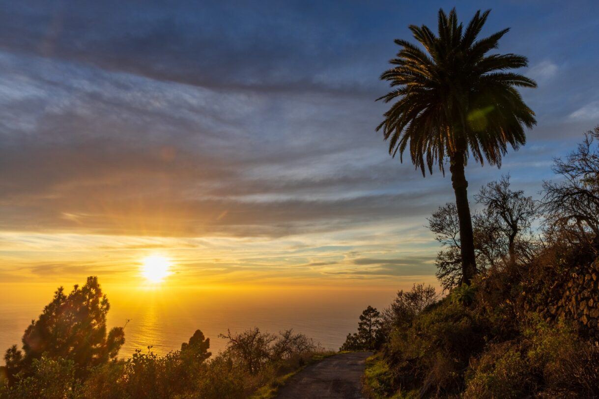 Gold, Rosa und Blau legen sich über Hügel und Meer. Palmen zeichnen sich als dunkle Silhouetten ab, Wege verlieren sich langsam im Schatten. Dann wirkt Tijarafe nicht spektakulär – sondern wahr.